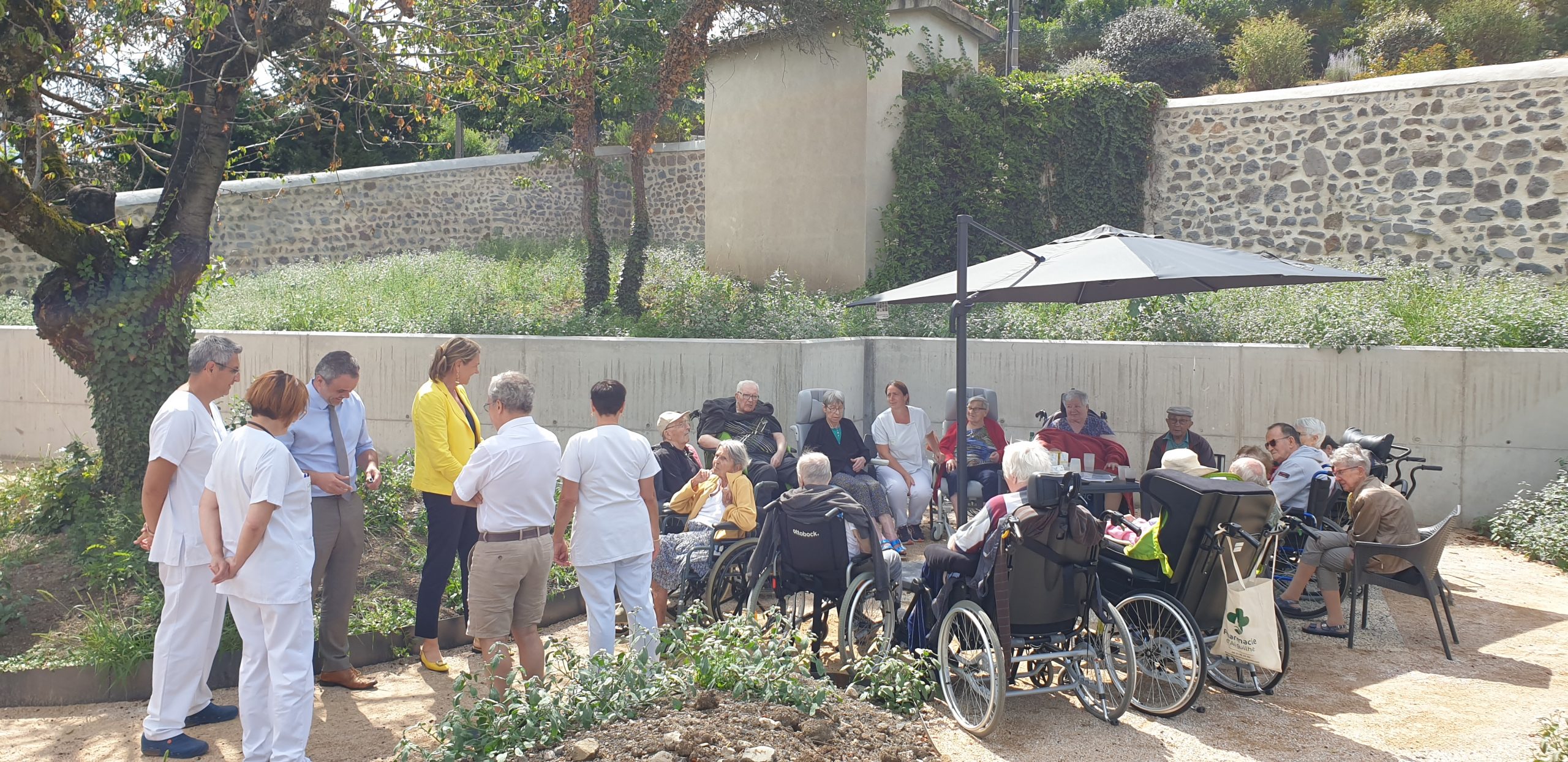 Suite à cet échange, la petite délégation a pu découvrir la nouvelle passerelle donnant accès au jardin thérapeutique et rencontrer une partie des résidents qui profitaient du beau temps.